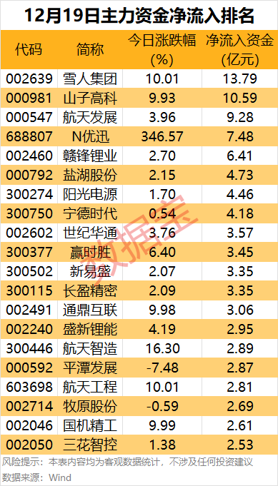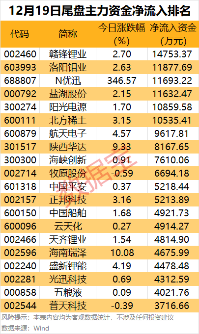 从个股来看,赣锋锂业、洛阳钼业、N优迅、盐湖股份、阳光电源、北方稀土6股尾盘主力资金净流入金额超1亿元。