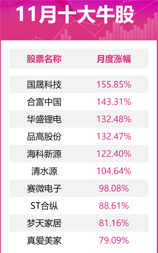 截至11月28日收盘,11月十大牛股中涨幅最大的为国晟科技,累计涨幅155.85%;其次为合富中国,累计涨幅143.31%。这10股中有6股涨幅超过100%。月度十大牛股里还有一只ST股为ST合纵,月累计涨幅88.61%。