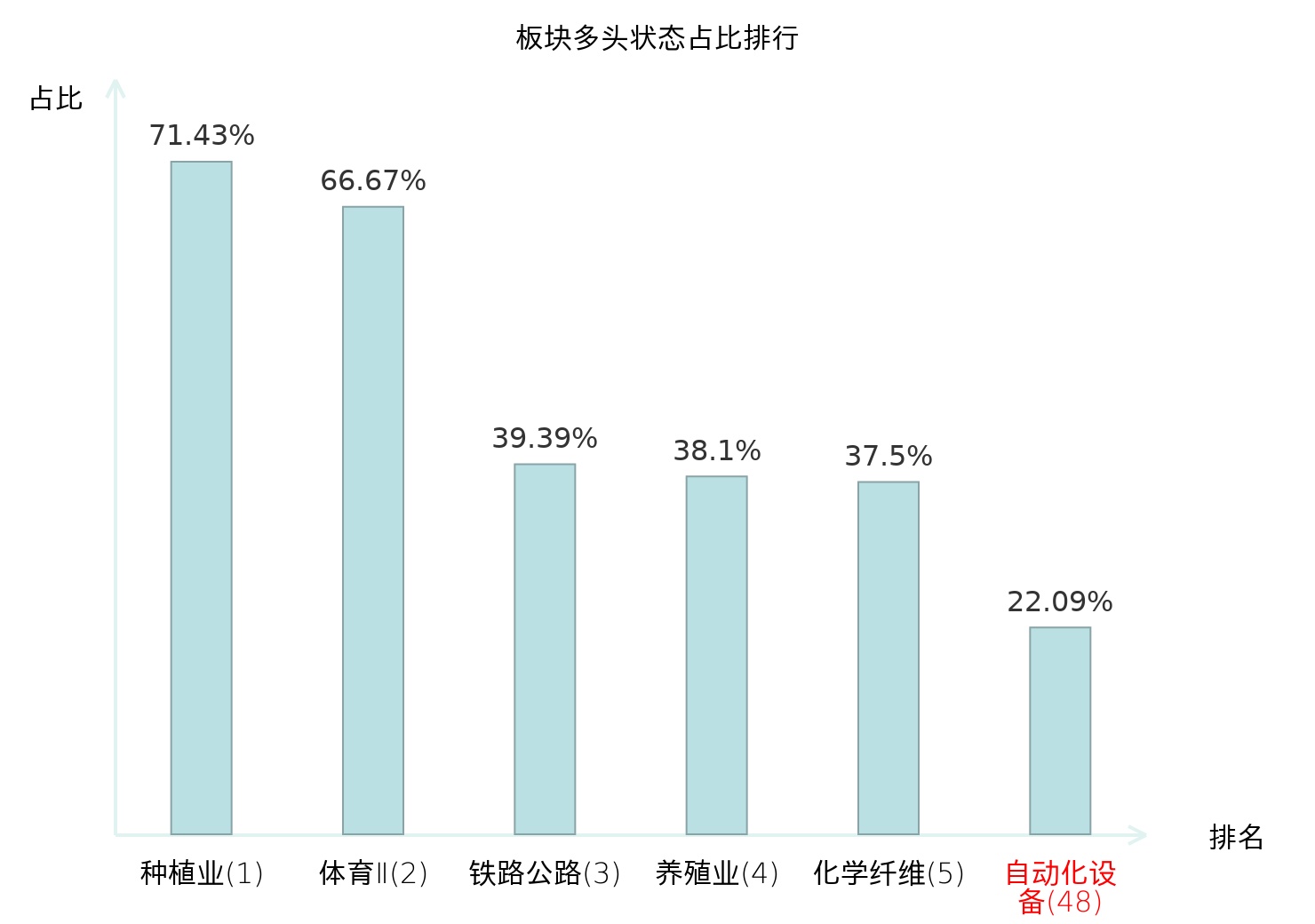 全市场所有行业板块中主力多头状态占比排名中,种植业板块位居第一。养殖业板块名次提升最快,较昨日上升99位。