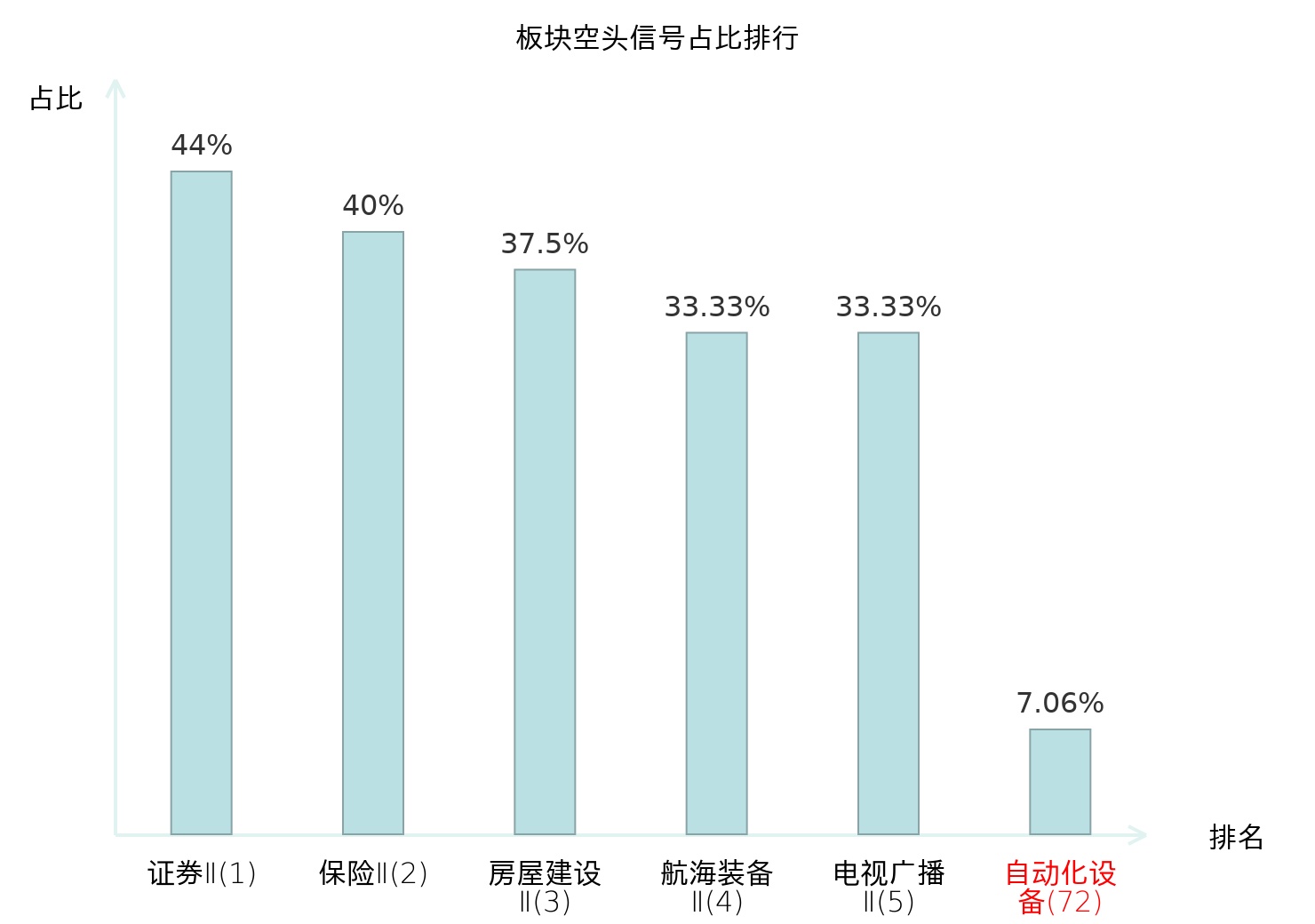 全市场所有行业板块中主力空头信号占比排名中,证券Ⅱ板块位居第一。证券Ⅱ板块名次提升最快,较昨日上升125位。