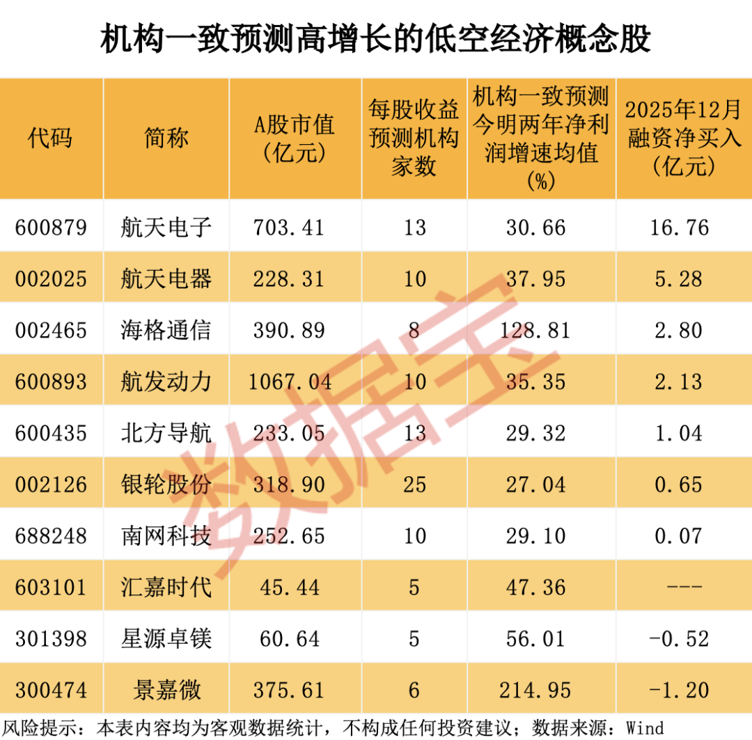据数据宝统计,从未来增长潜力来看,根据5家及以上机构一致预测,2026年、2027年净利润增速均有望超20%的低空经济概念股有10只。