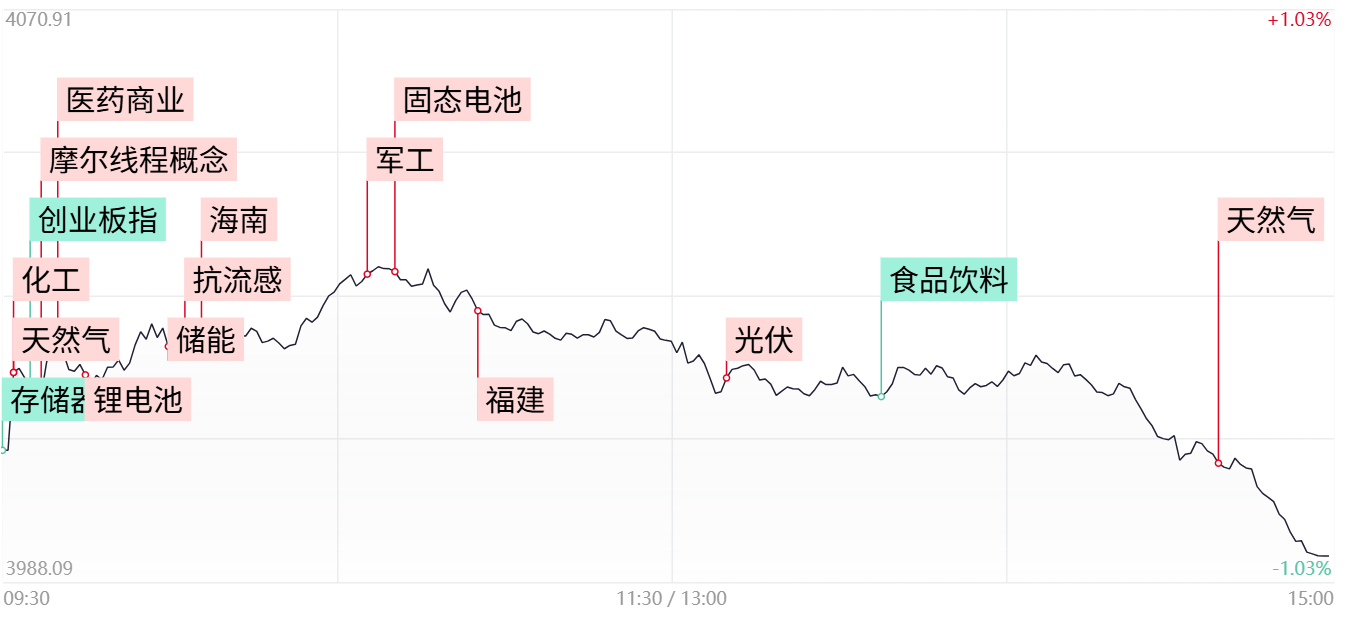 财联社11月14日讯,市场全天震荡调整,沪指跌近1%,创业板指跌近3%。沪深两市成交额1.96万亿,较上一个交易日缩量839亿。盘面上,市场热点较为杂乱,全市场超3300只个股下跌。从板块来看,锂电板块延续强势,孚日股份7连板,石大胜华3连板。福建板块逆势爆发,平潭发展、海峡环保涨停。燃气板块逆势走强,首华燃气20cm涨停。流感概念股反复活跃,金迪克5天3板,众生药业3天2板。海南板块表现活跃,海南海药涨停。下跌方面,算力硬件方向集体回调,存储芯片概念重挫,佰维存储跌超10%;CPO概念震荡调整,“易中天”光模块三巨头走弱。截至收盘,沪指跌0.97%,深成指跌1.93%,创业板指跌2.82%。