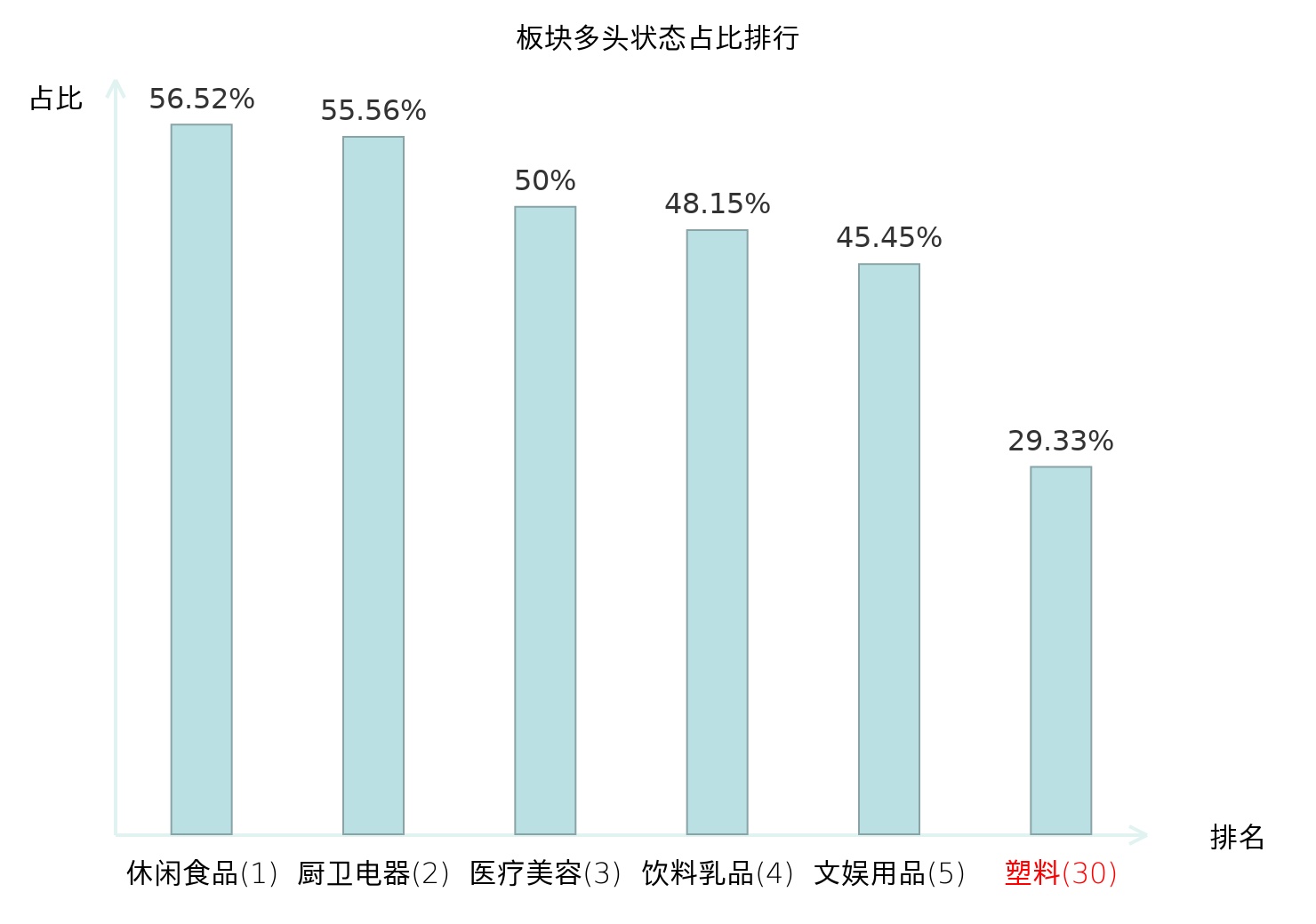 全市场所有行业板块中主力多头状态占比排名中,休闲食品板块位居第一。旅游及景区板块名次提升最快,较昨日上升64位。