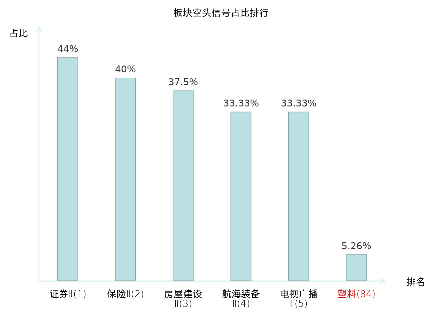 全市场所有行业板块中主力空头信号占比排名中,证券Ⅱ板块位居第一。证券Ⅱ板块名次提升最快,较昨日上升125位。