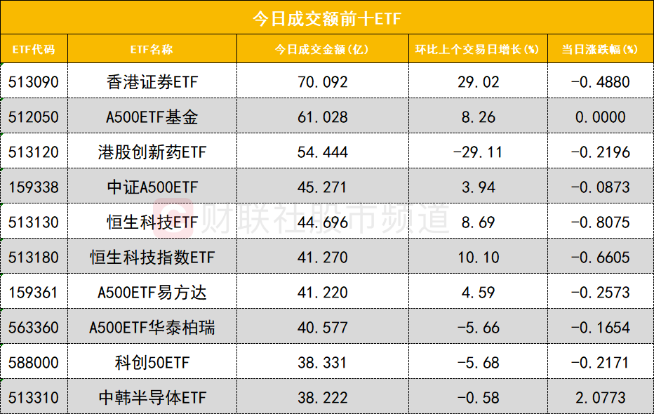 从成交额前十的ETF来看,香港证券ETF(513090)成交额位居首位,A500ETF基金(512050)成交额位居次席。
