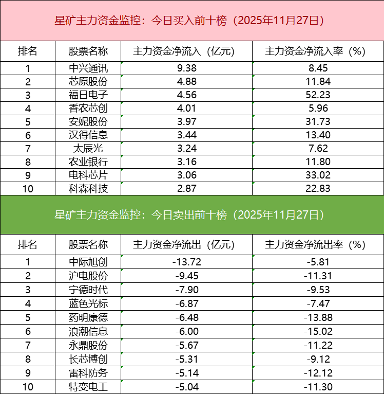 主力资金流出前十的个股所属板块较为分散,中际旭创净流出居首。