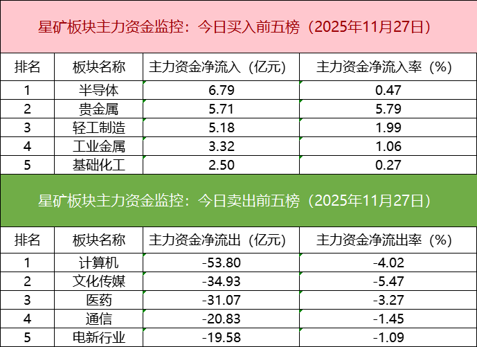 从主力板块资金监控数据来看,半导体板块主力资金净流入居首。