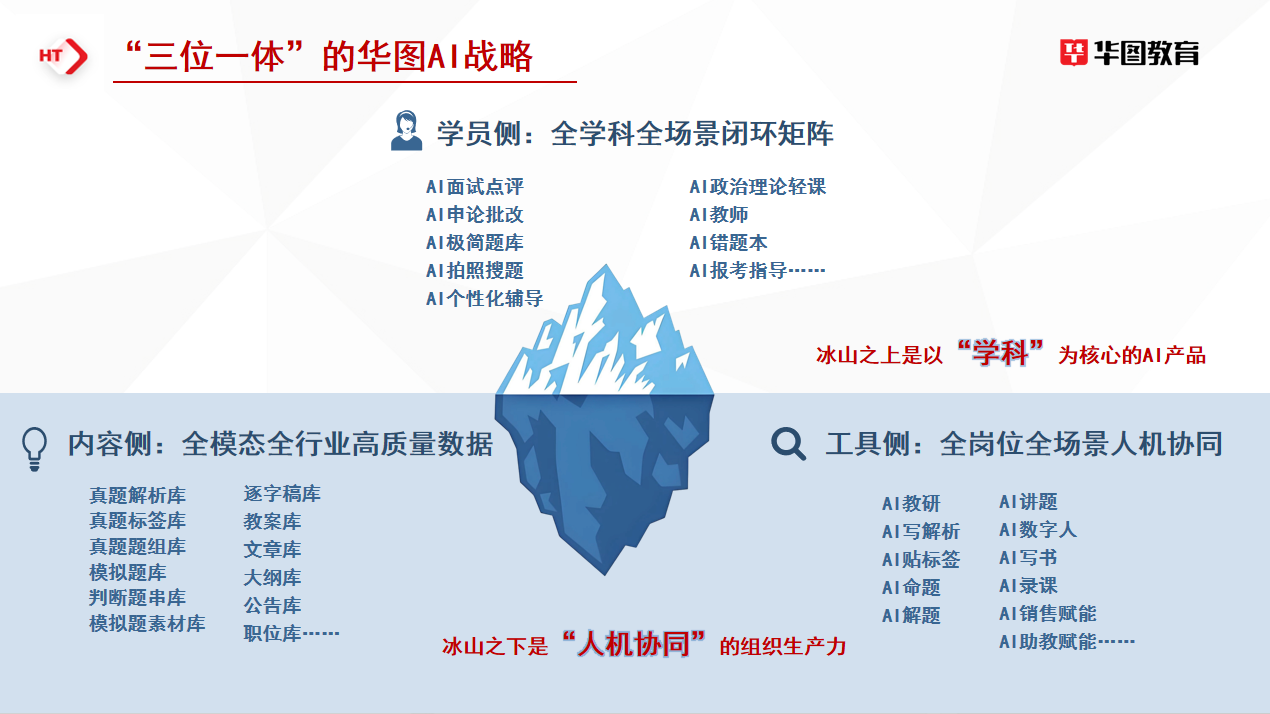 蔡金龙借“冰山模型”阐述了他的底气,“冰面之上,是以学科为核心的AI产品矩阵;冰面之下,则是高质量数据驱动与人机协同机制共同构成的组织生产力,这才是真正的核心竞争力,只有华图这样的大机构才能做到,其他人要模仿也是很有难度的”。
