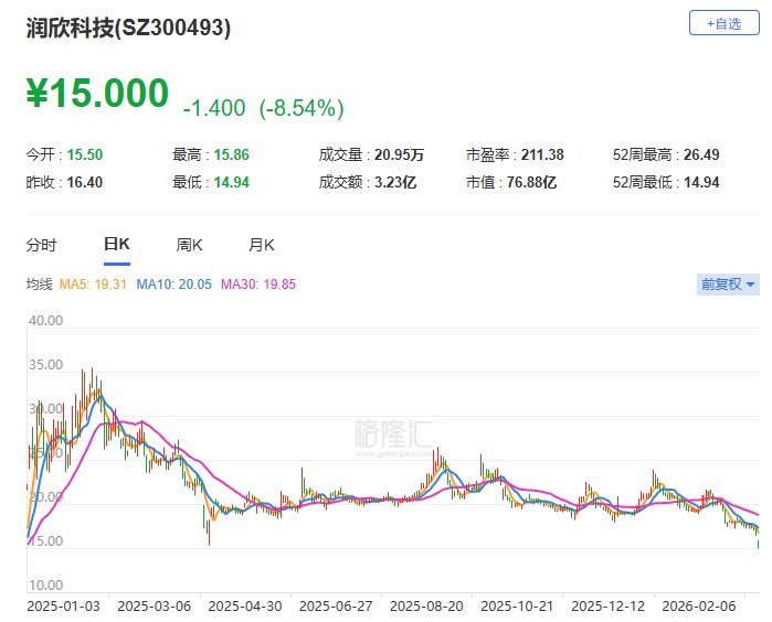 A股异动丨润欣科技跌近9% 股价创逾15个月新低