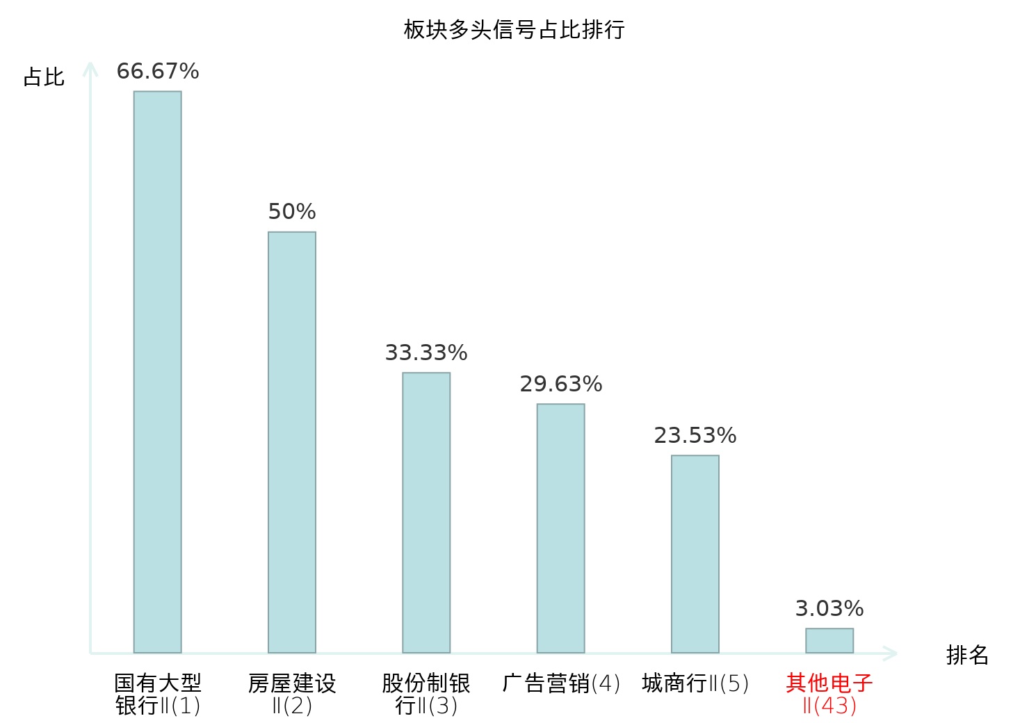 全市场所有行业板块中主力多头信号占比排名中,国有大型银行Ⅱ板块位居第一。国有大型银行Ⅱ板块名次提升最快,较昨日上升122位。
