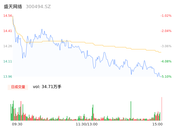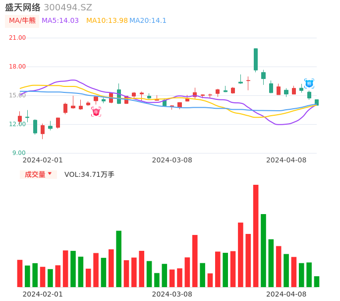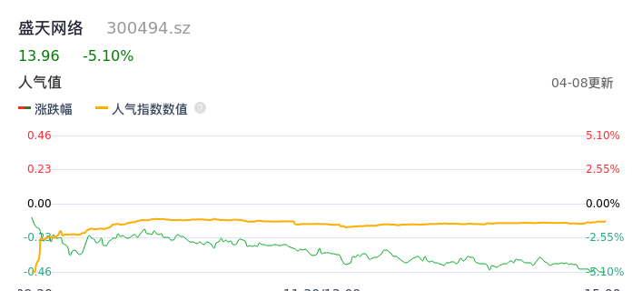 04月08日,盛天网络收报13.96,股价涨幅-5.10%,成交金额4.93亿元,换手率8.69%。