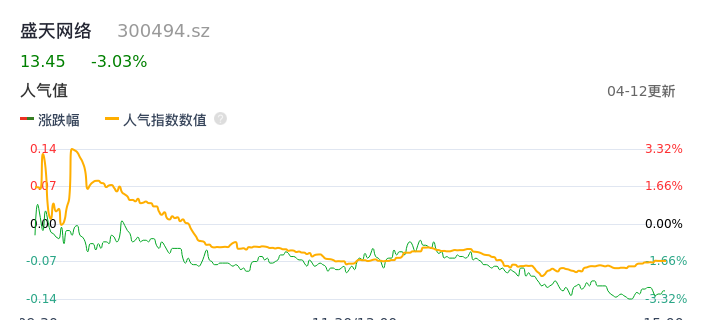 04月12日,盛天网络收报13.45,股价涨幅-3.03%,成交金额3.95亿元,换手率7.25%。
