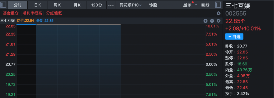 游戏股早间集体走强,板块指数高开高走一度放量涨超3%。三七互娱以涨停价开盘,星辉娱乐、冰川网络、游族网络等涨幅居前。