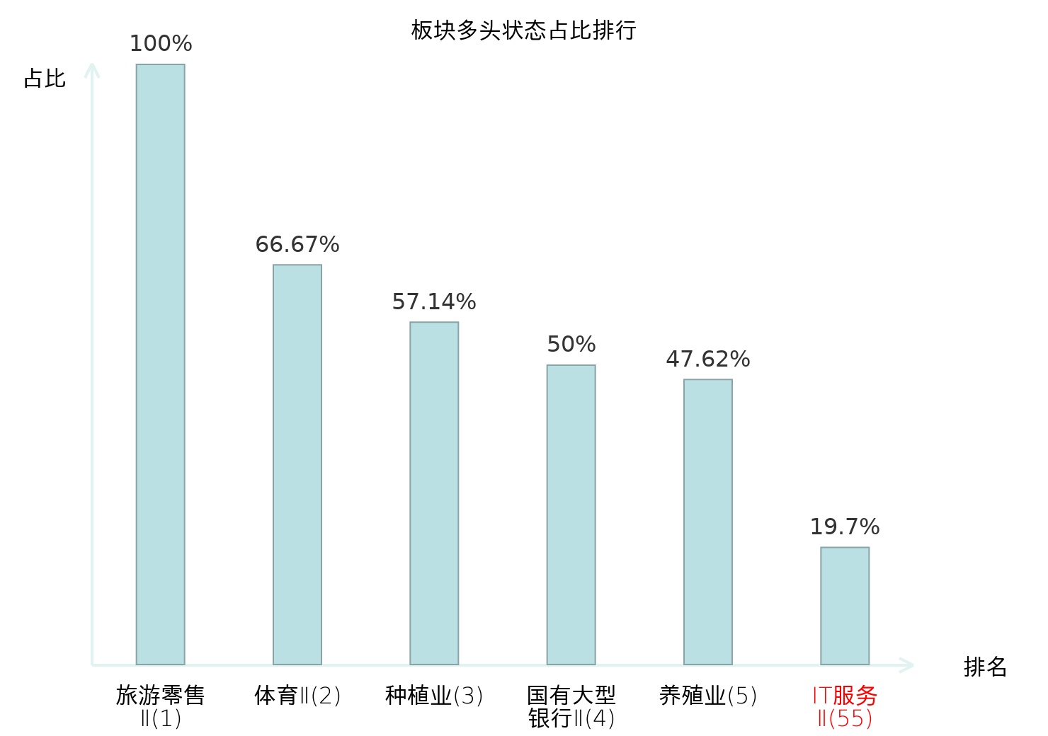 全市场所有行业板块中主力多头状态占比排名中,旅游零售Ⅱ板块位居第一。互联网电商板块名次提升最快,较昨日上升89位。
