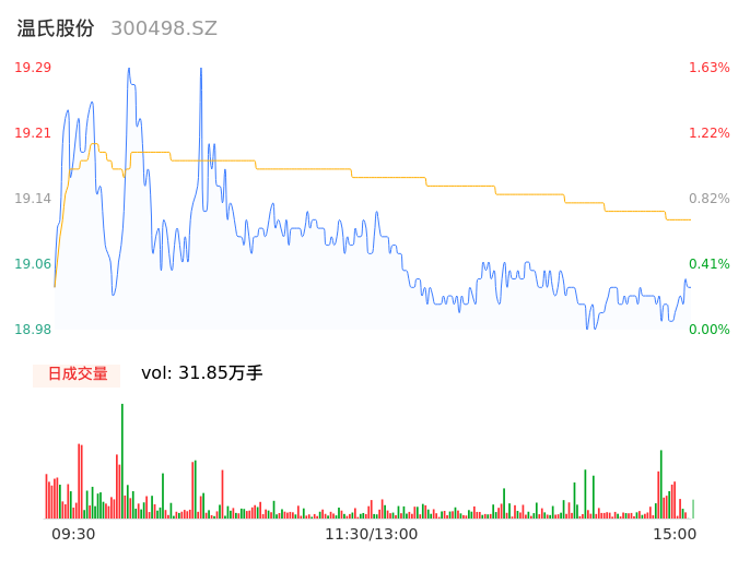 03月26日,温氏股份收报19.00,股价涨幅0.11%,成交金额6.09亿元,换手率0.59%。