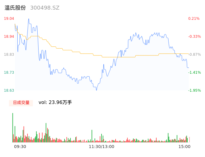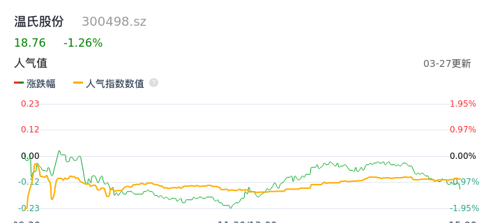03月27日,温氏股份收报18.76,股价涨幅-1.26%,成交金额4.51亿元,换手率0.44%。