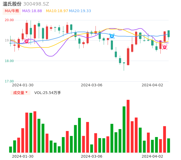 04月02日,温氏股份收报19.17,股价涨幅-1.39%,成交金额4.91亿元,换手率0.47%。