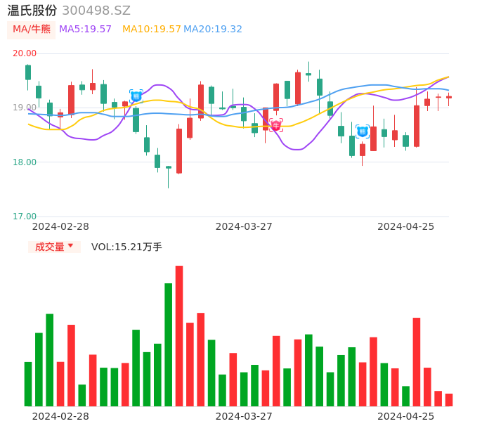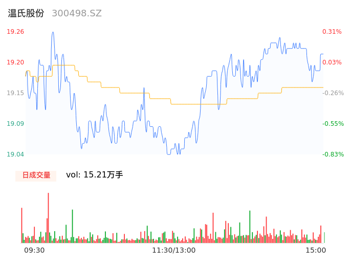 04月25日,温氏股份收报19.21,股价涨幅0.05%,成交金额2.91亿元,换手率0.28%。