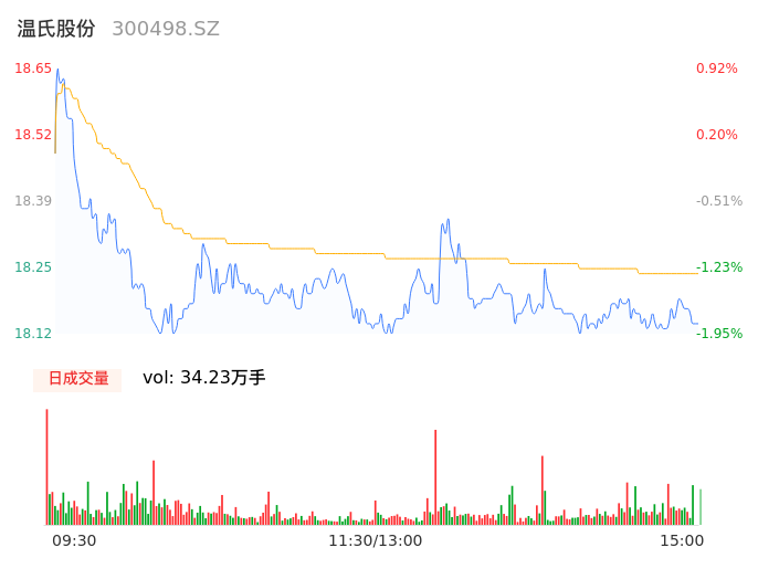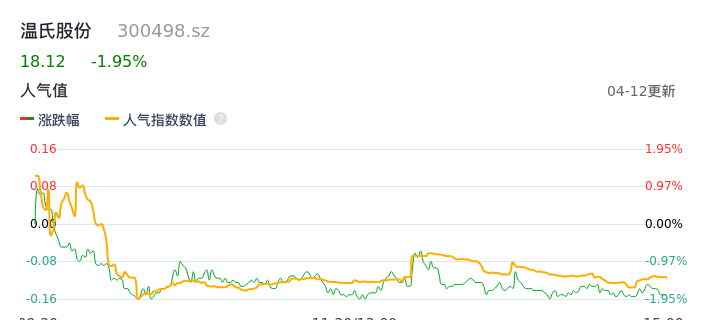 04月12日,温氏股份收报18.12,股价涨幅-1.95%,成交金额6.24亿元,换手率0.63%。