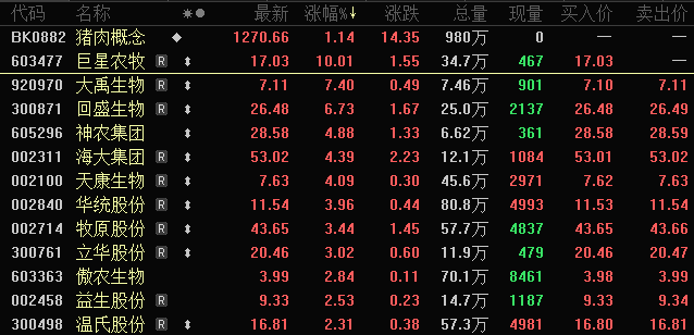 4月2日,猪肉板块逆市大涨,猪肉指数收涨1.3%。成份股中,巨星农牧涨停;大禹生物大涨7.4%;神农集团、海大集团、天康生物等股跟涨,幅度均逾4%。