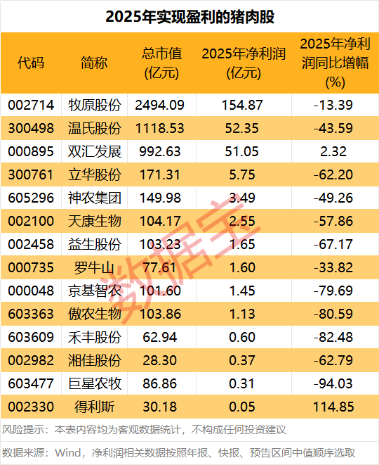 从净利润变动看,多数企业2025年净利润同比下降。双汇发展小幅增长2.32%,得利斯同比实现扭亏为盈。