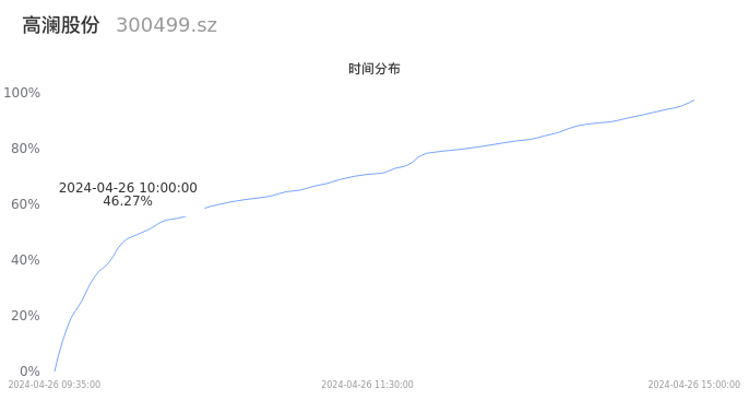 根据成交分布分析,该股票当天放量成交,成交清淡。时间上看,早盘前半小时成交量占据当天总成交量的46.27%;价格上看,成交呈现中间峰。成交分布分析主要研究股票成交的分布特性,不具有预测功能,请知悉。