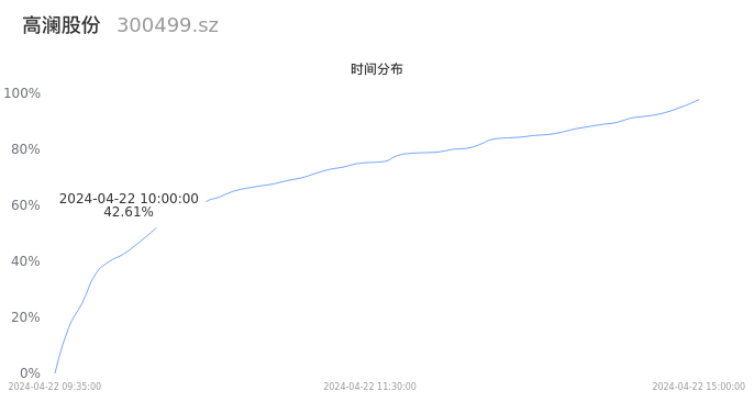 首先我们来看当日成交的时间分布。将今日交易时间按照5分钟的时间间隔进行切片,并绘制分布直方图进行观察。可以发现,10点之前的成交量占全天成交量的42.61%,这说明,该股票活跃时段换手火爆,资金热情高涨。