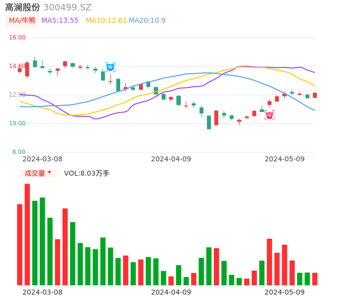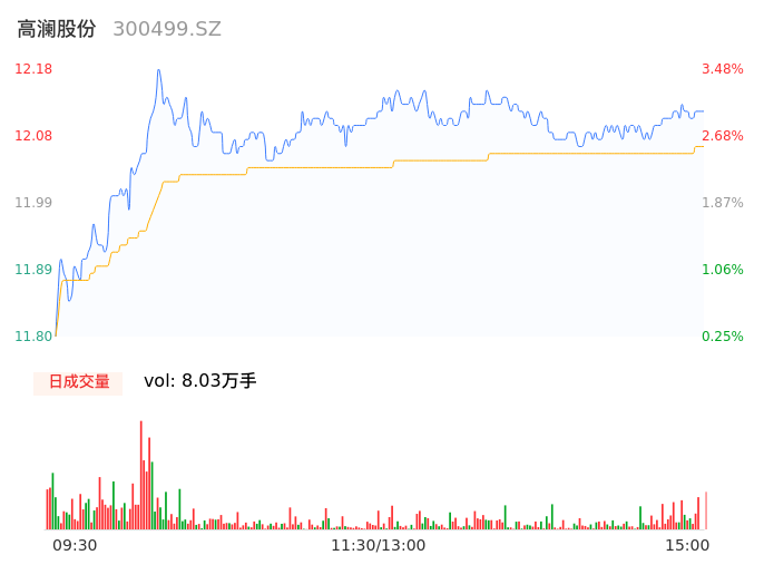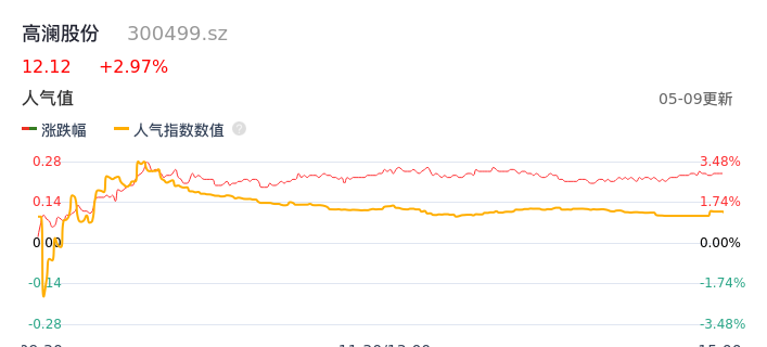 05月09日,高澜股份收报12.12,股价涨幅2.97%,成交金额9692.52万元,换手率2.98%。