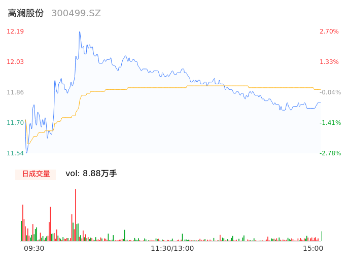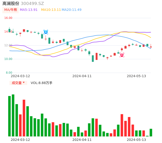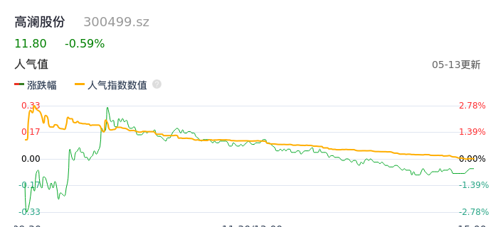 05月13日,高澜股份收报11.80,股价涨幅-0.59%,成交金额1.05亿元,换手率3.30%。