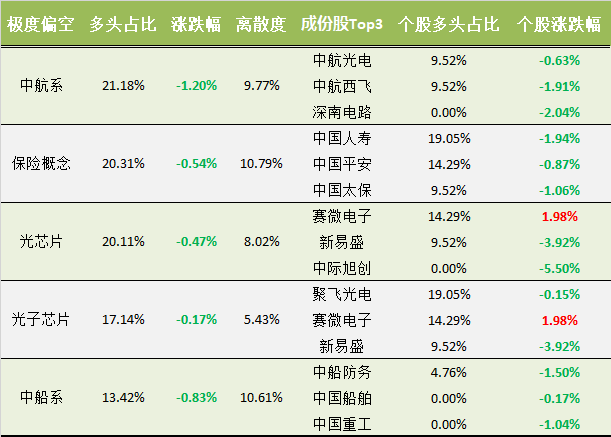 极度弱势概念:中航系、保险概念、光芯片、光子芯片、中船系五个概念依旧位于弱势榜。