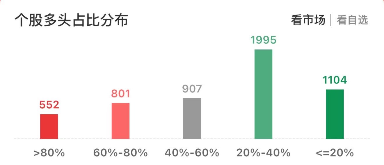 A股市场多空占比极度强势个股上涨至552只,偏多方向个股上涨至801只,多空均衡方向个股907只,偏空方向股票下降至1995只,极度偏空股票上升至1104只;