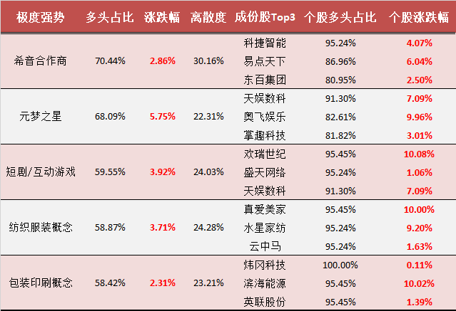 我们继续用多空盯盘产品对A股概念板块进行多空比例统计,得到各概念板块的多头占比分布以及离散程度,下表展示了多空比值最大/最小的Top5概念以及概念中的Top3成份股:
