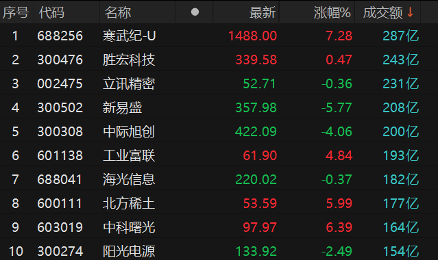 个股方面,寒武纪-U成交额居首,为287亿元。其次是胜宏科技、立讯精密、新易盛,成交额分别为243亿元、231亿元、208亿元。