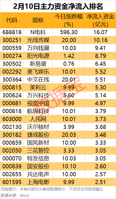 从个股来看,8股尾盘主力资金净流入金额均超1亿元,粤传媒万达电影尾盘主力资金净流入居前,均超1.5亿元,股价均为涨停。