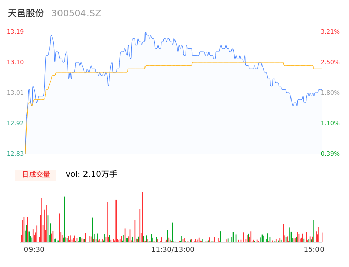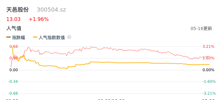 05月16日,天邑股份收报13.03,股价涨幅1.96%,成交金额2748.12万元,换手率0.96%。