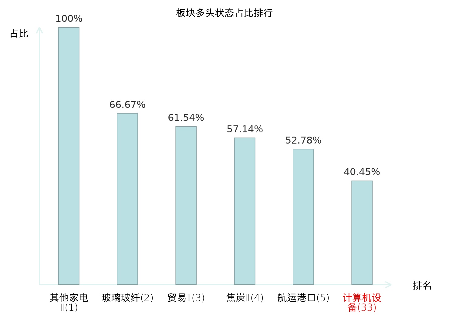 全市场所有行业板块中主力多头状态占比排名中,其他家电Ⅱ板块位居第一。影视院线板块名次提升最快,较昨日上升62位。