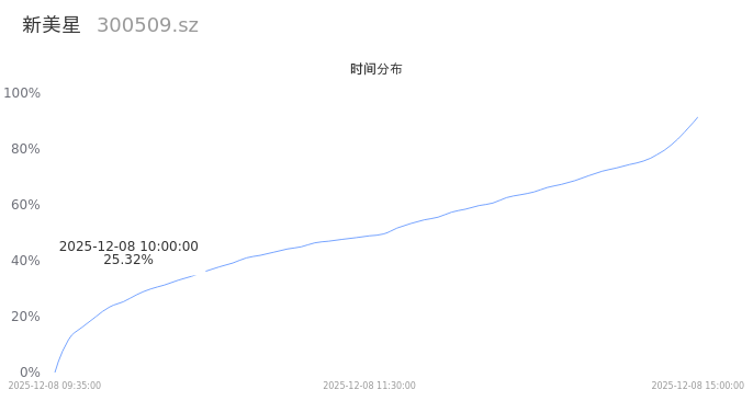 300509新美星2025年12月08日成交22.26万手,成交金额2.91亿,相较昨日缩量10.25万手,换手率9.01%,成交清淡。