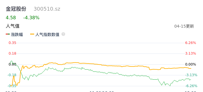 04月15日,金冠股份收报4.58,股价涨幅-4.38%,成交金额6757.04万元,换手率1.77%。
