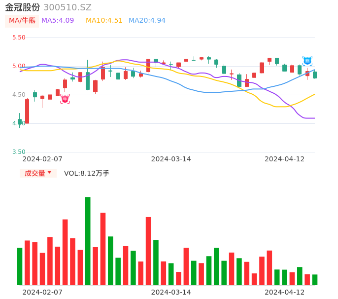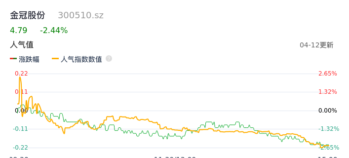 04月12日,金冠股份收报4.79,股价涨幅-2.44%,成交金额3937.25万元,换手率0.99%。