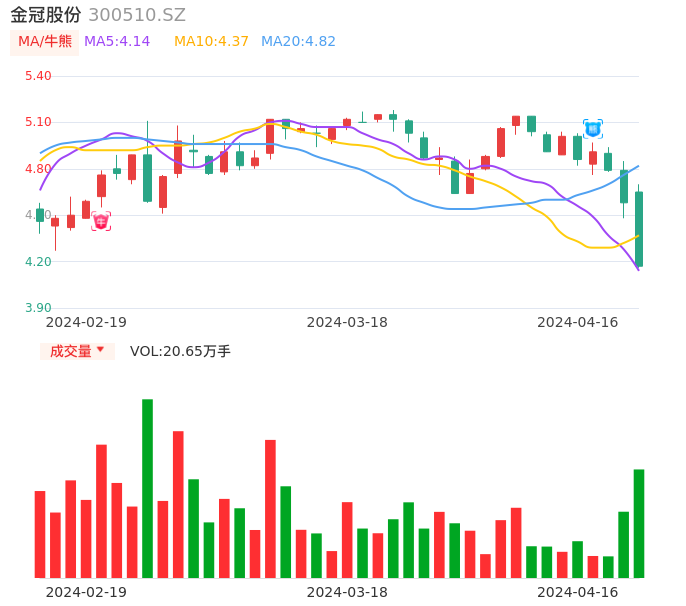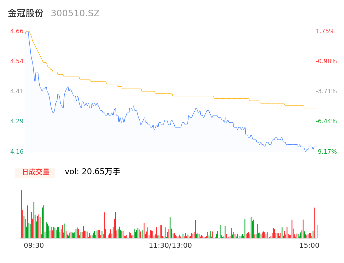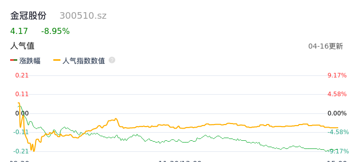 04月16日,金冠股份收报4.17,股价涨幅-8.95%,成交金额8959.18万元,换手率2.51%。