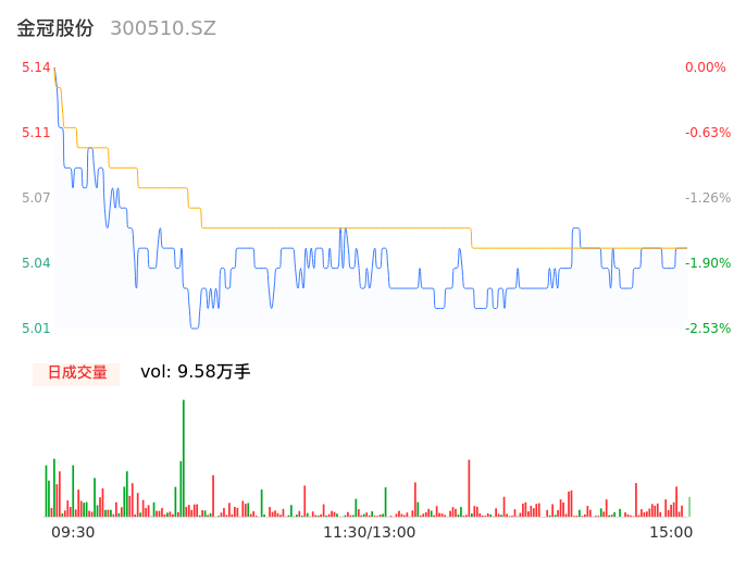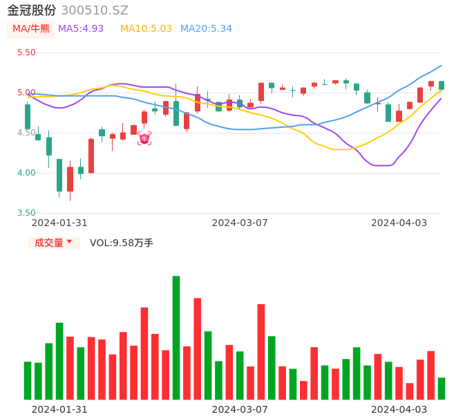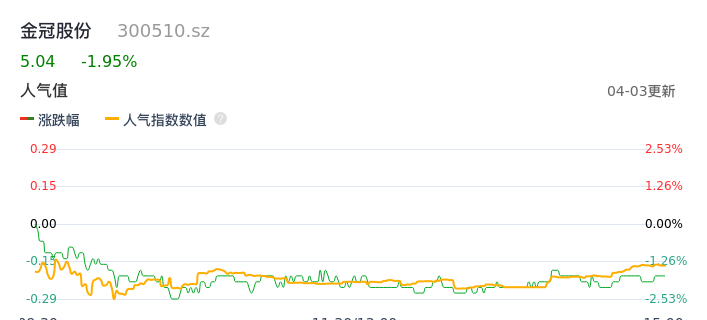 04月03日,金冠股份收报5.04,股价涨幅-1.95%,成交金额4837.53万元,换手率1.16%。