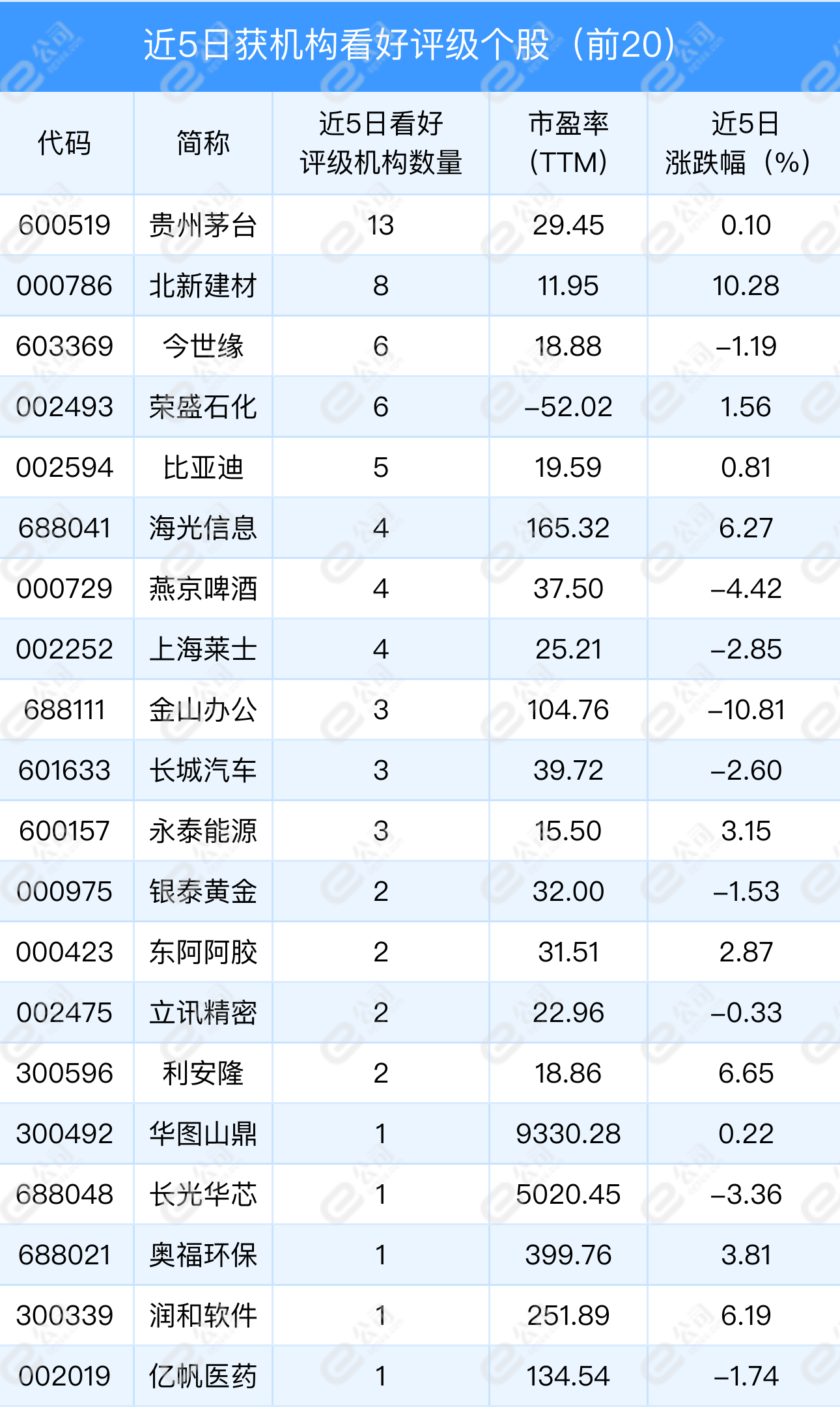 11只个股在近期被机构集中推荐,近5日内机构给予“买入”或“增持”等看好评级家数均逾3家及以上。具体来看,贵州茅台(13家)、北新建材(8家)、今世缘(6家)、荣盛石化(6家)、比亚迪(5家)等5只个股近期机构看好评级家数居前,均达到5家以上,此外,包括海光信息、燕京啤酒、上海莱士、金山办公、长城汽车等在内的10只个股期间机构看好评级家数均在2家以上。