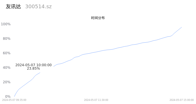 首先我们来看当日成交的时间分布。将今日交易时间按照5分钟的时间间隔进行切片,并绘制分布直方图进行观察。可以发现,10点之前的成交量占全天成交量的23.85%,这说明,该股票活跃时段换手率一般,资金热度较一般。