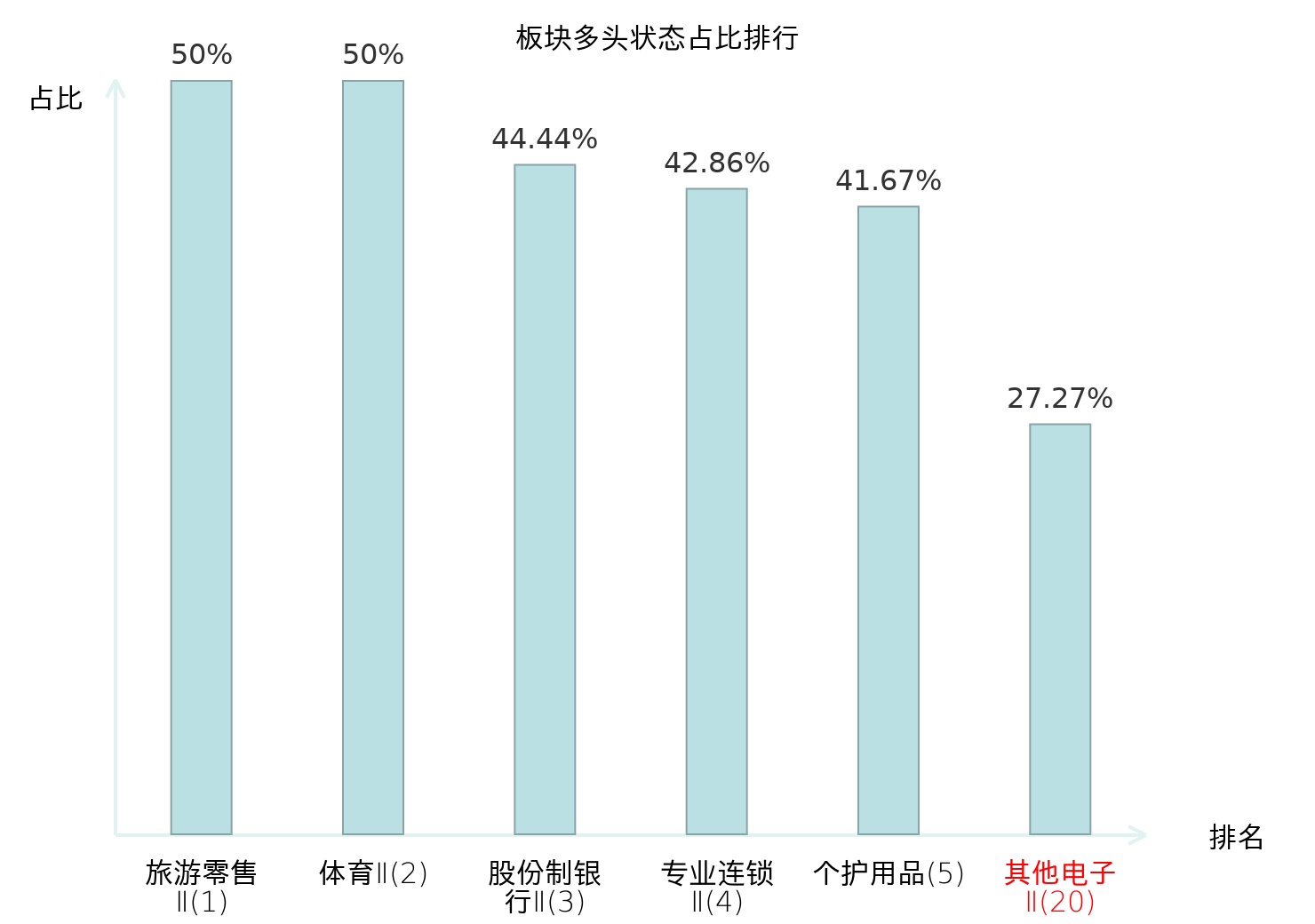 全市场所有行业板块中主力多头状态占比排名中,旅游零售Ⅱ板块位居第一。贵金属板块名次提升最快,较昨日上升83位。