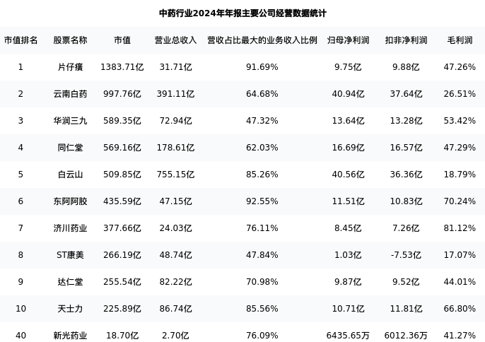 新光药业最新报告期数据为年报,下表汇总了中药行业内市值靠前的公司年报主要经营数据