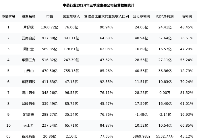 新光药业最新报告期数据为三季度,下表汇总了中药行业内市值靠前的公司三季度主要经营数据