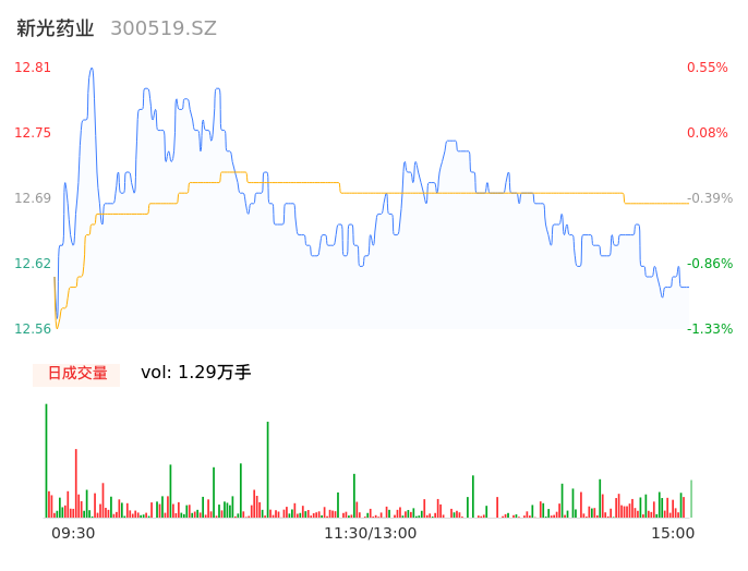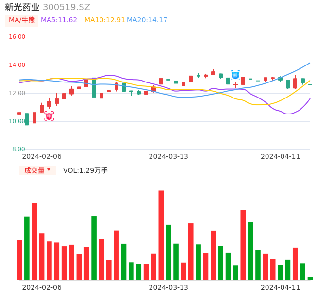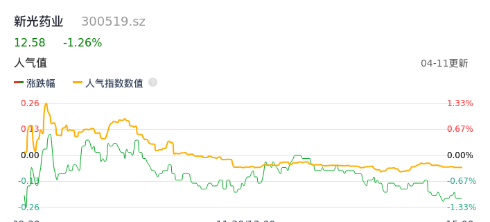 04月11日,新光药业收报12.58,股价涨幅-1.26%,成交金额1634.48万元,换手率1.13%。
