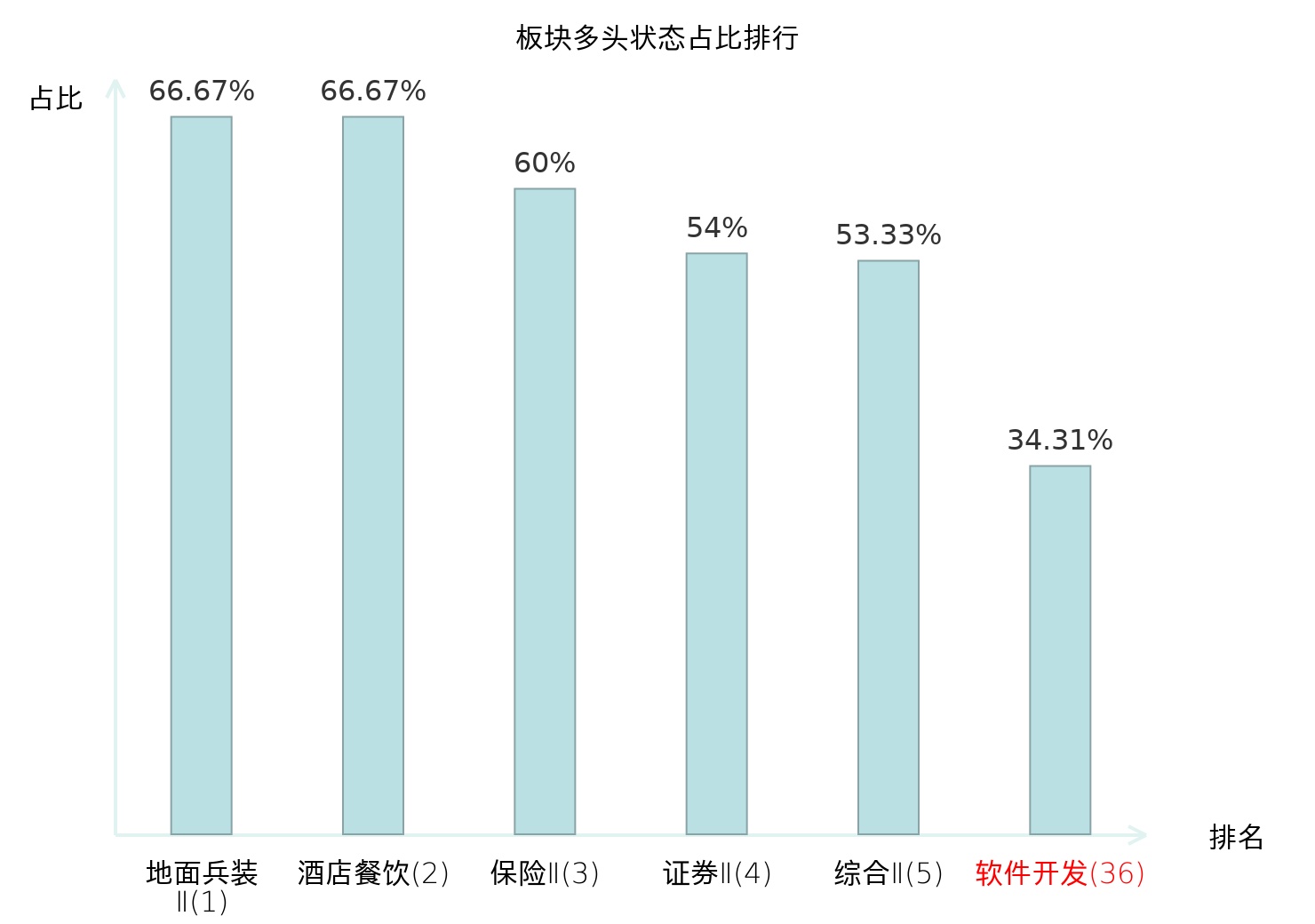 全市场所有行业板块中主力多头状态占比排名中,地面兵装Ⅱ板块位居第一。计算机设备板块名次提升最快,较昨日上升48位。