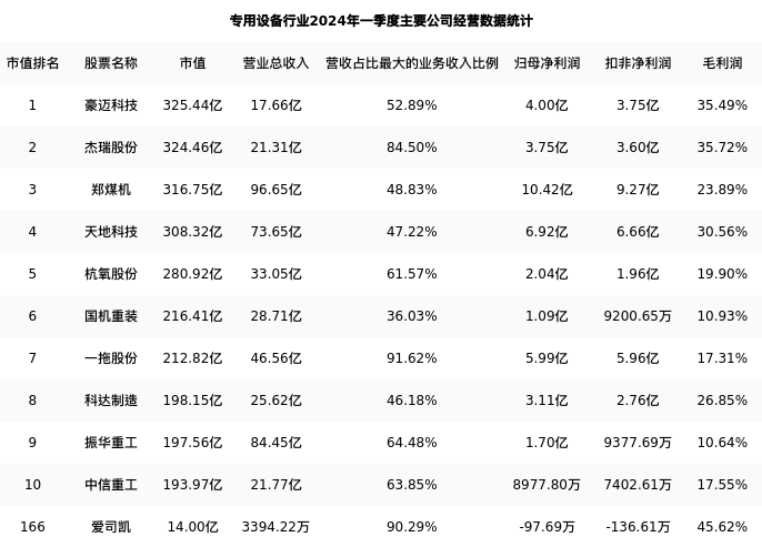 爱司凯最新报告期数据为一季度,下表汇总了专用设备行业内市值靠前的公司一季度主要经营数据