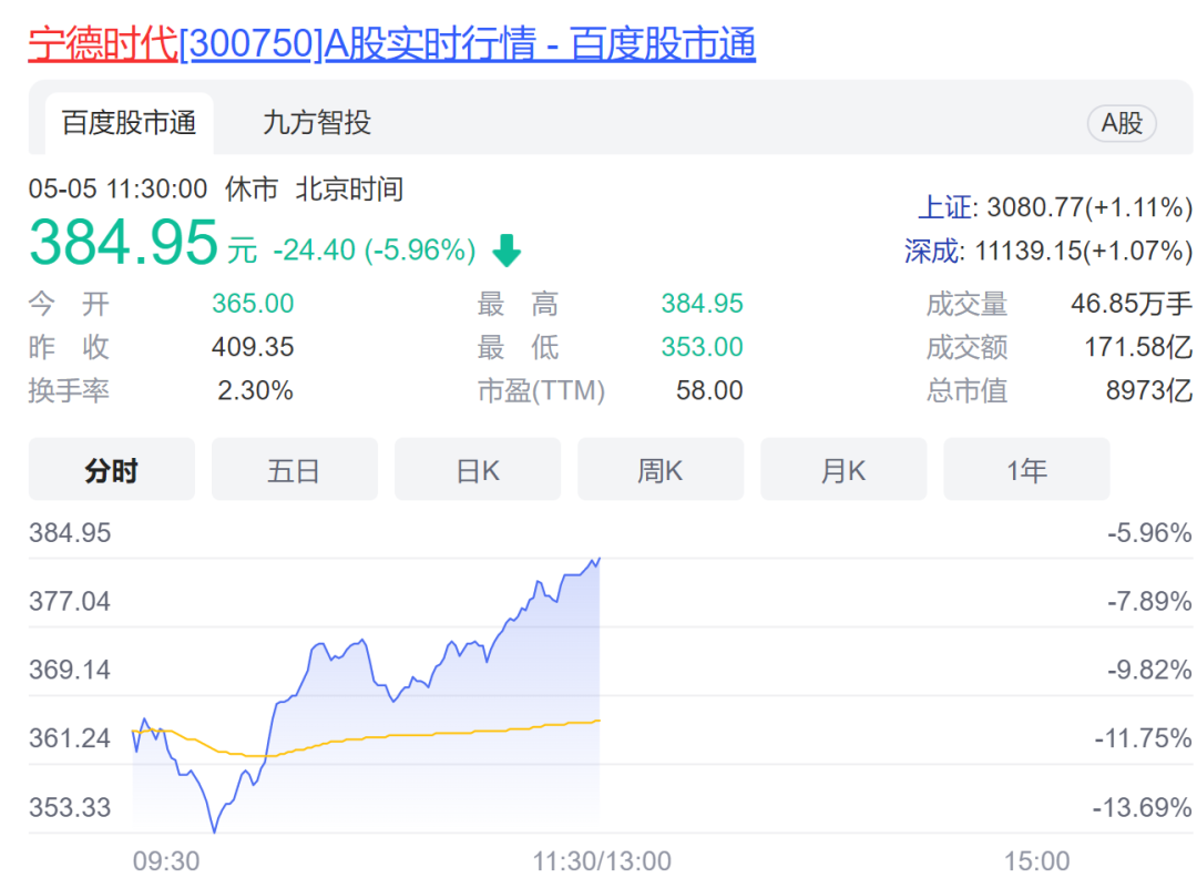 被投资者称为戏称为“宁王”的创业板第一市值股宁德时代今日早盘大幅低开10.83%,并一度探低至353元跌近14%,创近1年来新低,较最高点692元跌去近50%。截至午间收盘,宁德时代虽有所反弹,但仍大跌5.96%。成交171.6亿元,创历史最高。Wind实时监测数据显示,有5.82亿元主力资金净流出宁德时代。